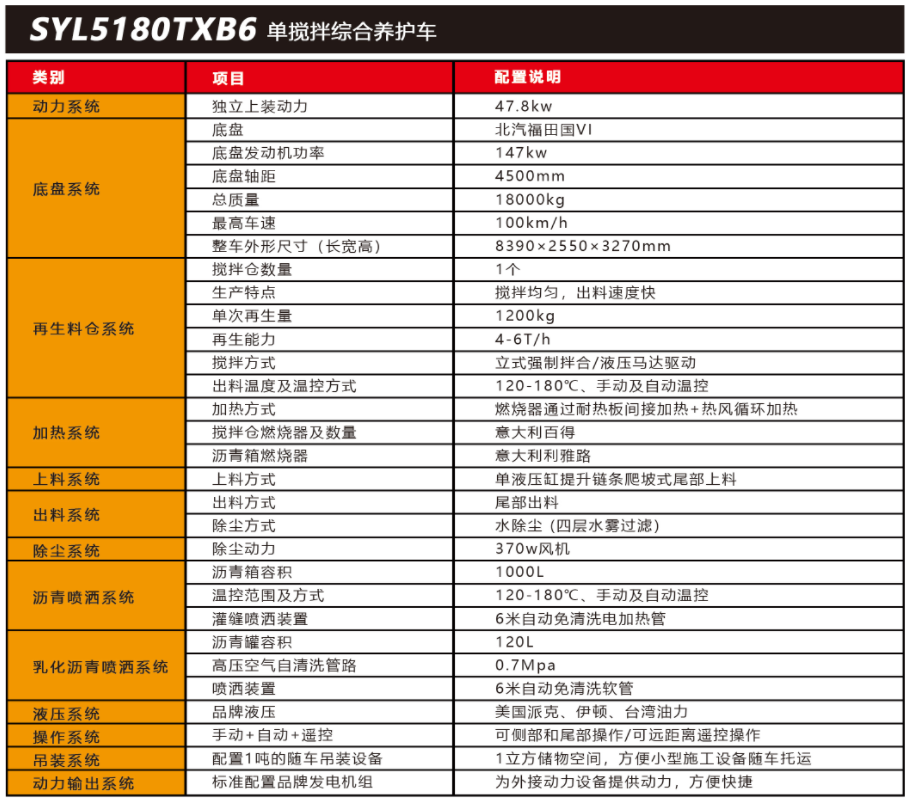 SYL5180TXB6 單攪拌綜合養(yǎng)護(hù)車是一款集現(xiàn)場(chǎng)生產(chǎn)新瀝青混合料、瀝青路面冷料、 舊料、銑刨料 100%現(xiàn)場(chǎng)加熱再生利用 ,熱瀝青灑布、裂紋跟蹤灌縫、乳化瀝青噴灑、為 其他裝置提供電力和液壓動(dòng)力等多種功能于一體的瀝青路面熱再生綜合養(yǎng)護(hù)車??蓪?shí)現(xiàn)多 場(chǎng)合、多路面的各種類養(yǎng)護(hù)作業(yè) ,養(yǎng)護(hù)修補(bǔ)費(fèi)用低 ,作業(yè)快捷 ,高效率、節(jié)能環(huán)保性能突 出等特點(diǎn)。適用于遠(yuǎn)郊較寬闊區(qū)域中小施工量和高速公路的修補(bǔ)施工。